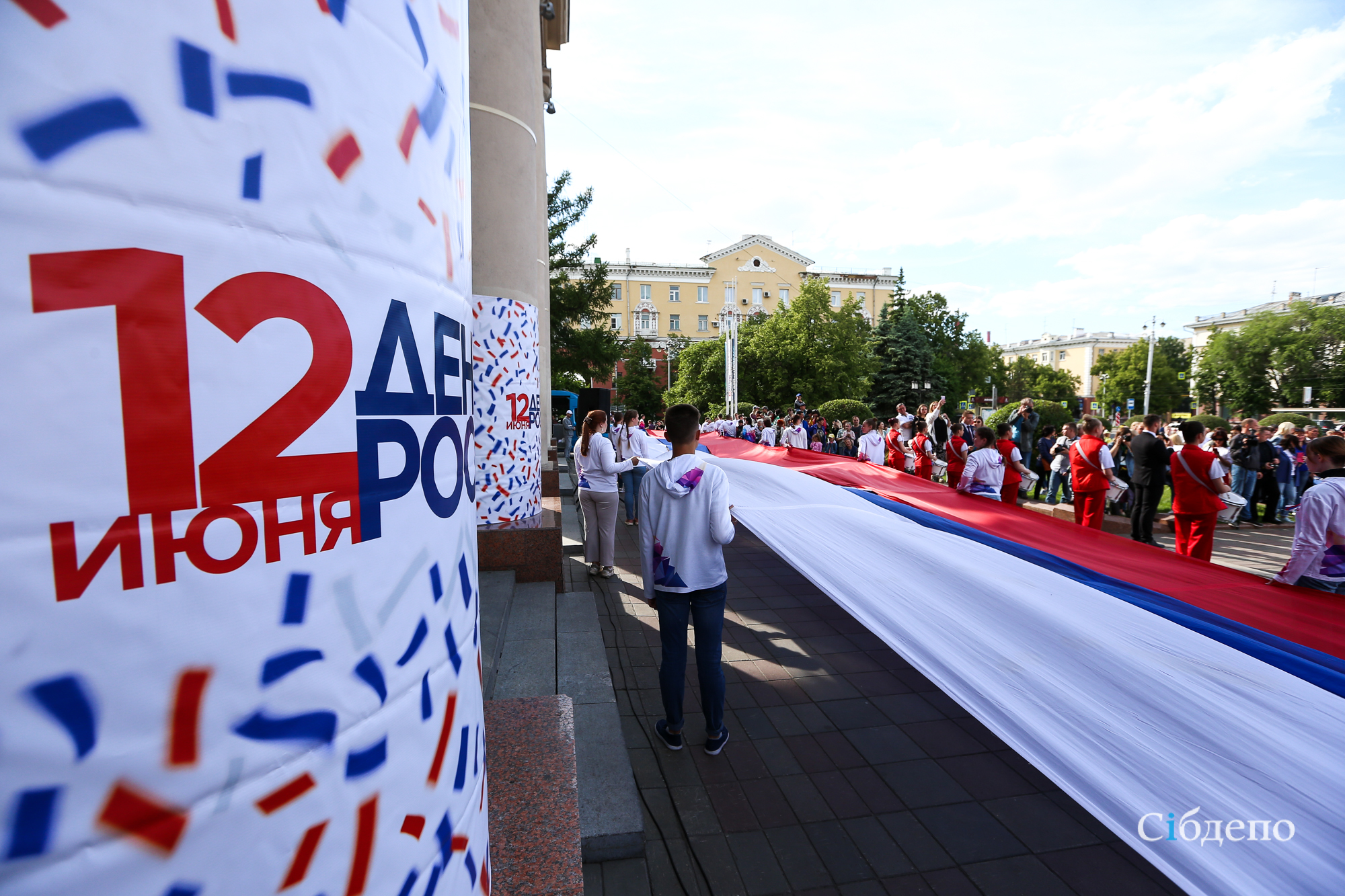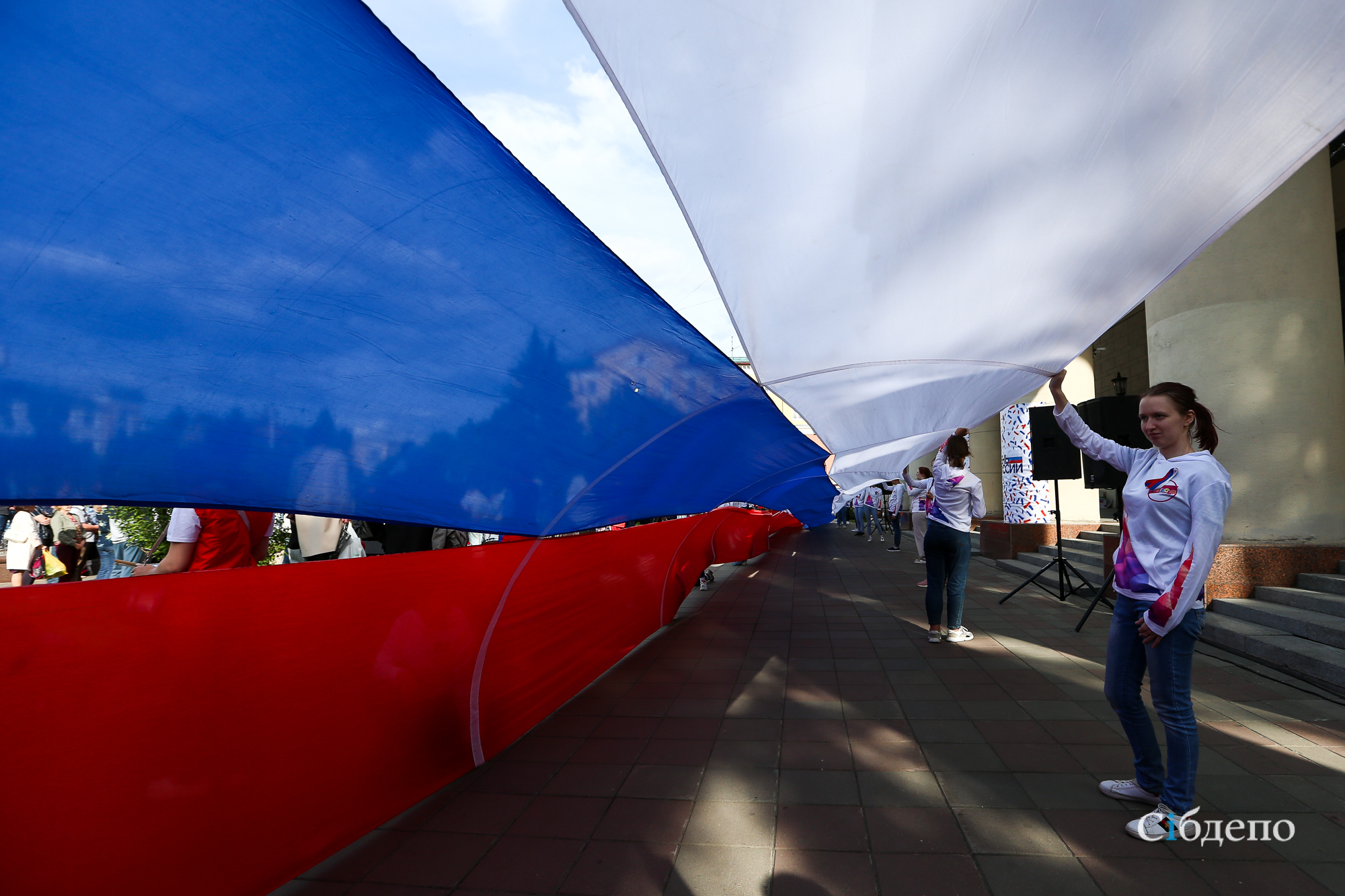 Здесь же развернулась хореографическая композиция на тему межнационального согласия. 60 активистов кемеровской молодёжи вынесли на площадь 56-метровый флаг России, затем все присутствующие исполнили гимн Российской Федерации.