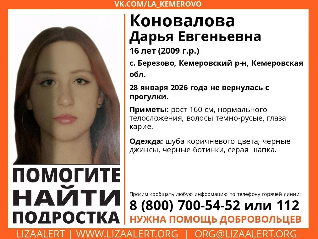 В Кемеровском муниципальном округе в селе Березово пропала 16-летняя Коновалова Дарья Евгеньевна. Девочка ушла гулять 28 января и до сих пор не вернулась, сообщают волонтеры поискового отряда Лиза Алерт.