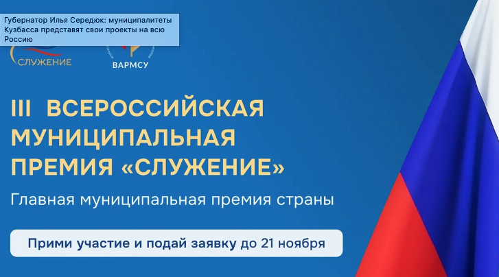 Кузбассовцы могут принять участие в III Всероссийской муниципальной премии «Служение». Она проводится по поручению Владимира Путина и при поддержке Администрации Президента РФ Всероссийской ассоциацией развития местного самоуправления (ВАРМСУ).