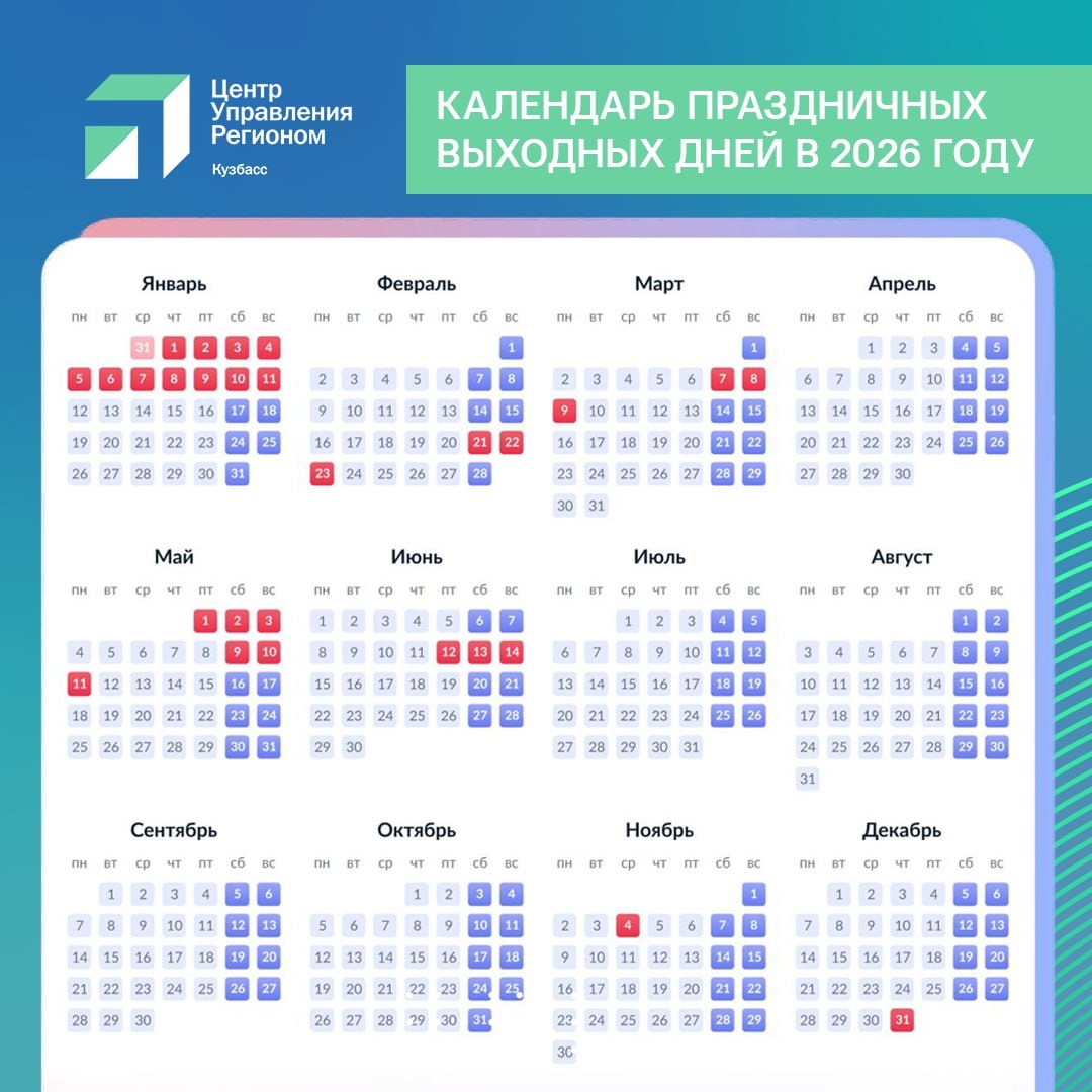 В России утвердили график праздников и переносов выходных дней на 2026 год. Об этом сообщает ЦУР Кузбасса.