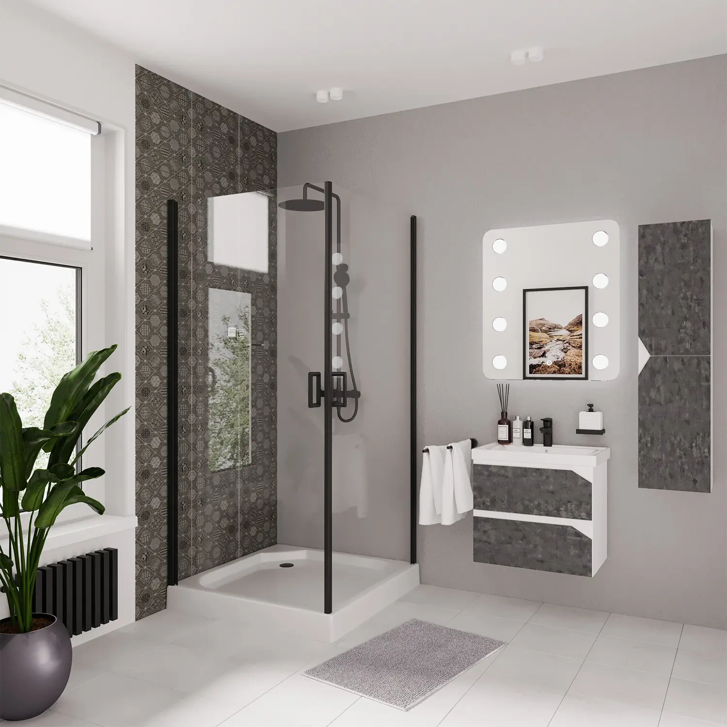 Душевая кабина — это полноценная герметичная конструкция, включающая поддон, стенки и двери, часто с дополнительными функциями, такими как гидромассаж, подсветка и встроенные полочки и сидения. Обычно она продаётся в виде готового комплекта и легко устанавливается.