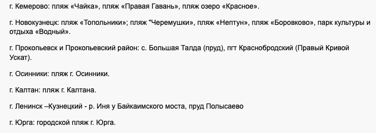 Из дозволенных для купания и отдыха на пляжах стали: территория пляжа, расположенного на берегу р. Кия, район «Белого камня» в Мариинске, Гавриловское водохранилище с прилегающим к нему берегом эко-комплекс «Салаирские плесы» в Салаире, зона рекреации акватории Беловского водохранилища, в целях занятия парусным спортом в палаточном лагере FUNKIDS» на базе отдыха » Парус» ООО» Фанспорт» в Беловоском муниципальном округе и там же в с. Менчереп зона купания акватории Беловского водохранилища, на базе МБУ ДСОЦ » Радуга» Беловского муниципального округа ДОЛ » Радуга».