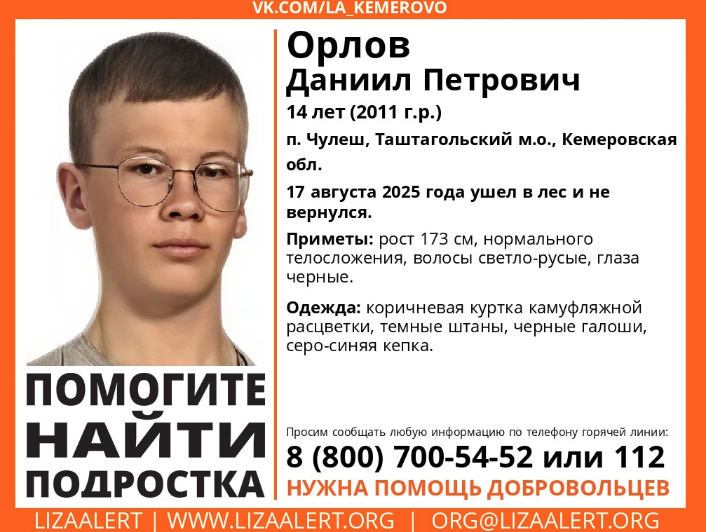 В поселке Чулеш Таштагольского муниципального округа пропал 14-летний Орлов Даниил Петрович. Мальчик 17 августа ушел с отцом за шишками в тайгу и потерялся. Отец не смог его найти и обратился к правоохранителям.