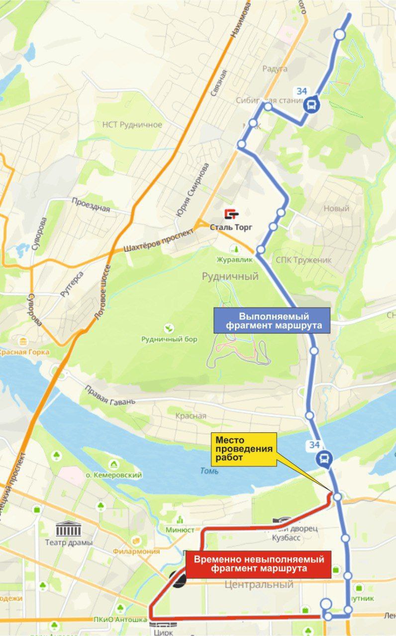 В связи с этим автобусы № 34 «Сквер Молодоженов – д.п. Центральный» будут ездить в прямом и обратном направлении по схеме: ул. Серебряный бор, просп. Кузбасский, просп. Шахтеров, б-р им. Академика Барбараша, ул. Терешковой, д.п. Центральный.
