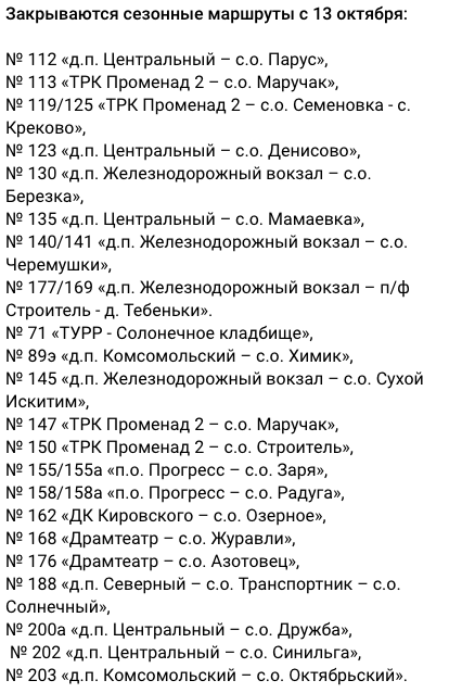 Также убирают заезд в с.о. «Мамаевка» по маршруту № 106 «д.п. Железнодорожный вокзал – с/з Ягуновский», рейс на 21:20 от «д.п. Железнодорожный вокзал». Автобусы по маршруту № 87 «Д/п Комсомольский – с.о. Южное» тем временем будут ездить до остановки «ул. 1-я линия».