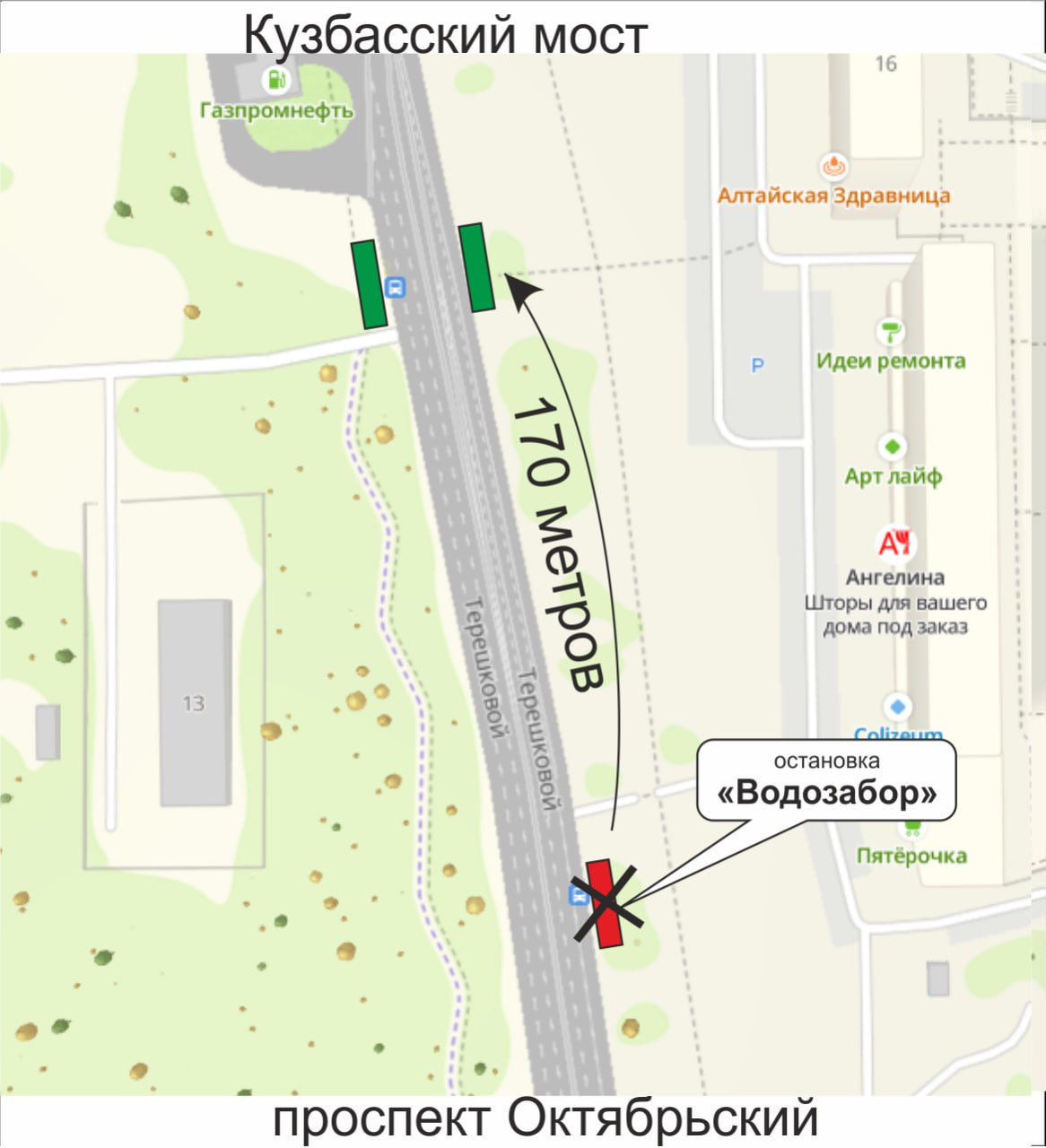 Это связано с открытием Кузбасского моста. Остановка «Водозабор» в сторону правого берега будет дальше от пр. Октябрьский на 170 метров.
