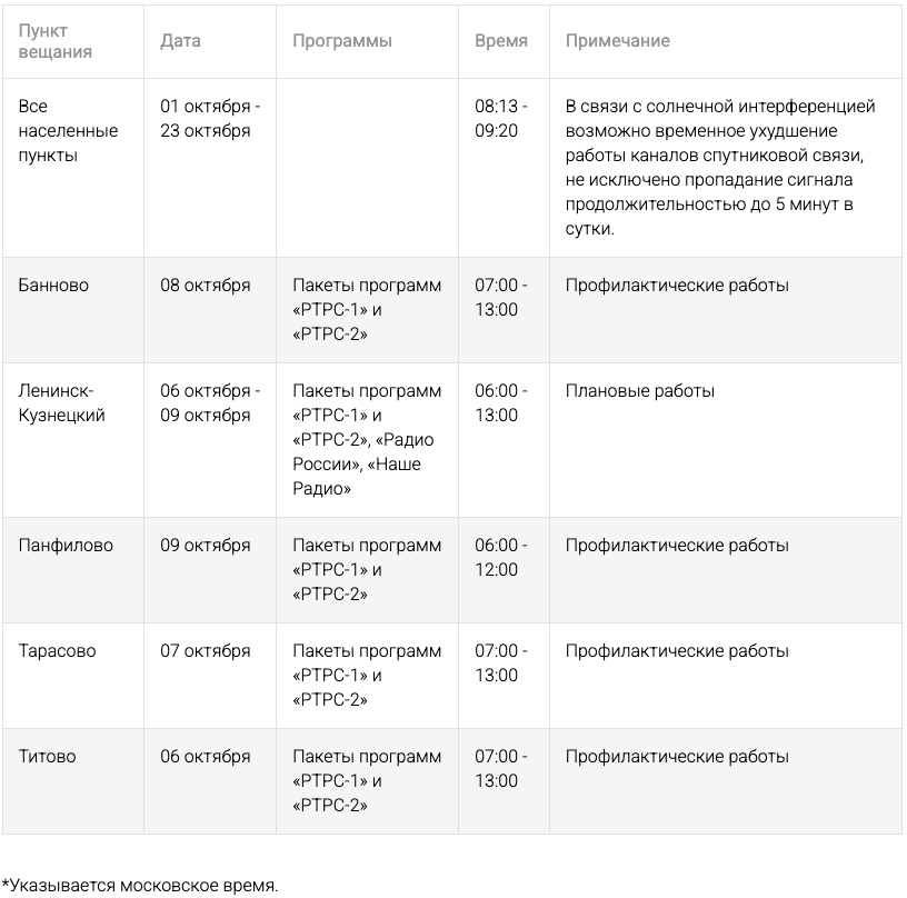 Муниципалитеты, в которых в это время будут проводиться профилактические и плановые работы, указаны в таблице РТРС.